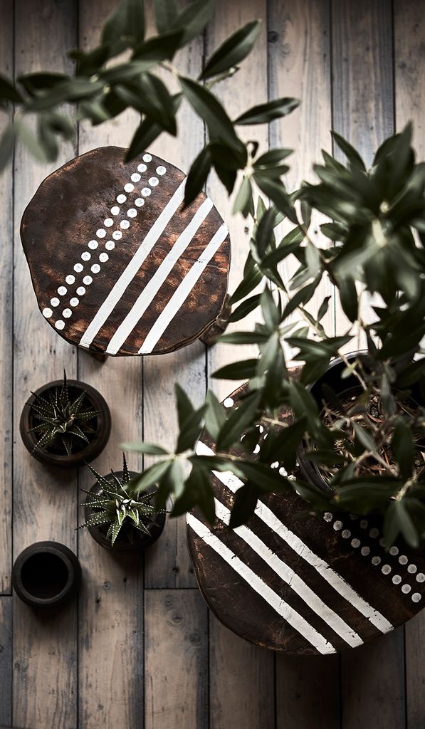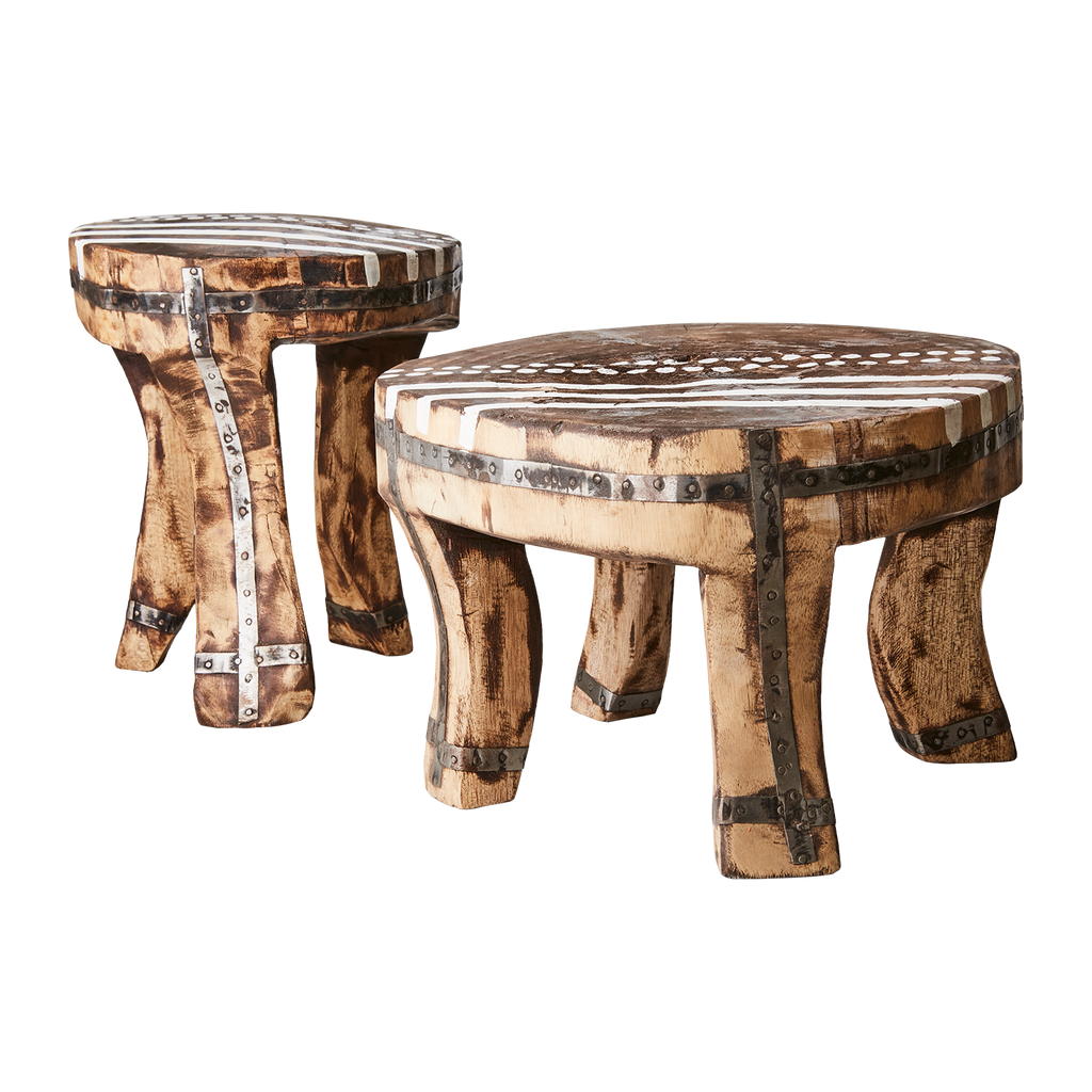Affari of Sweden TREASURE Pall är en utsökt handgjord möbel som kombinerar funktionalitet med unik design. Tillverkad i robust trä med en naturlig brun färg, denna pall är både hållbar och elegant. De dekorativa metallbanden som omger pallen ger en industriell känsla och förstärker dess stabilitet. Det vita mönstret på sitsen tillför en modern touch som kompletterar den rustika estetiken.