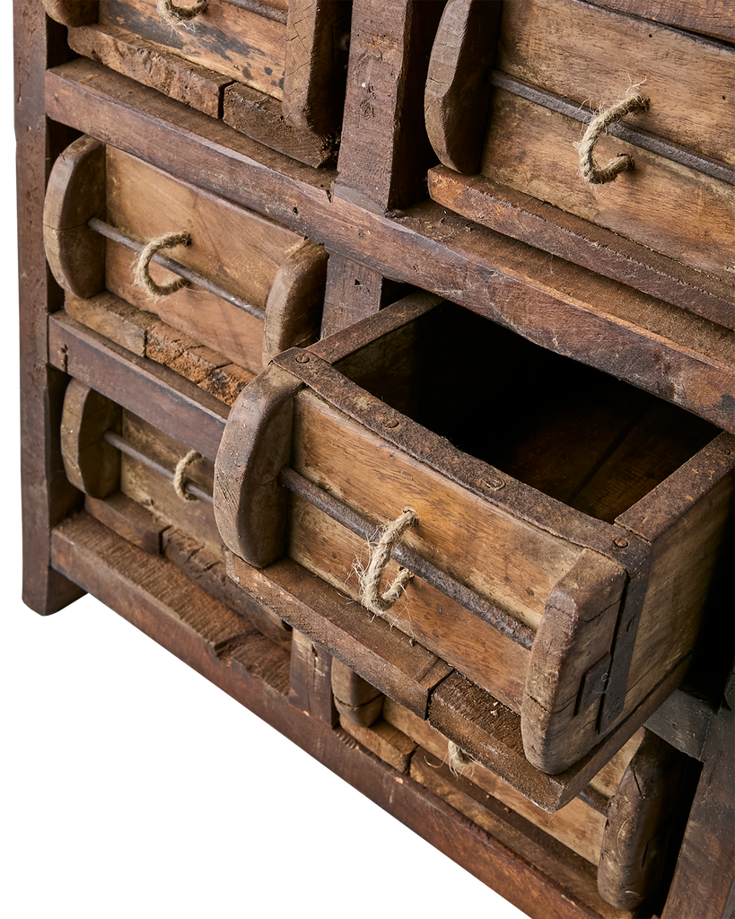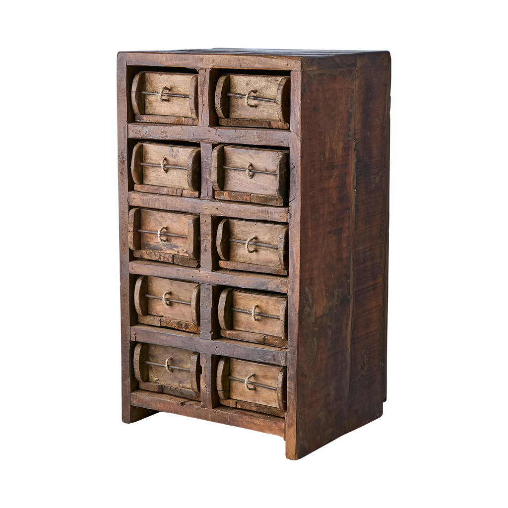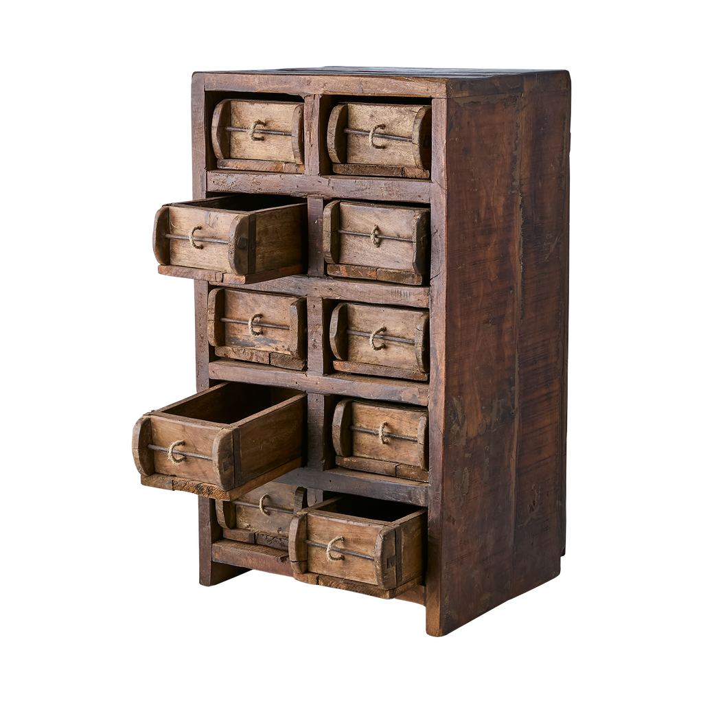 Upptäck det rustika och charmiga Affari of Sweden TREASURE Skåp, tillverkat av gamla tegelstensformar som återanvänds för att skapa ett unikt förvaringsmöbel. Skåpets naturliga träfinish ger varje rum en varm och inbjudande känsla. Med tio små lådor, alla med repöglor för enkel öppning, är detta skåp både dekorativt och funktionellt. Det passar perfekt för att organisera mindre föremål och ge ditt hem en vintage-touch.