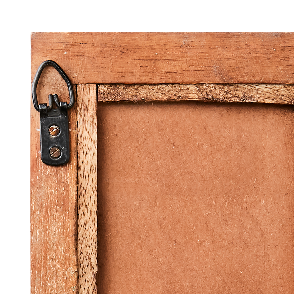 Spegelns ram är tillverkad av robust trä, vilket ger en varm och naturlig känsla. Spegelglaset bidrar till att sprida ljus och skapa en känsla av rymd. De olika färgtonerna på ramen ger ett levande och intressant utseende som drar blickarna till sig.