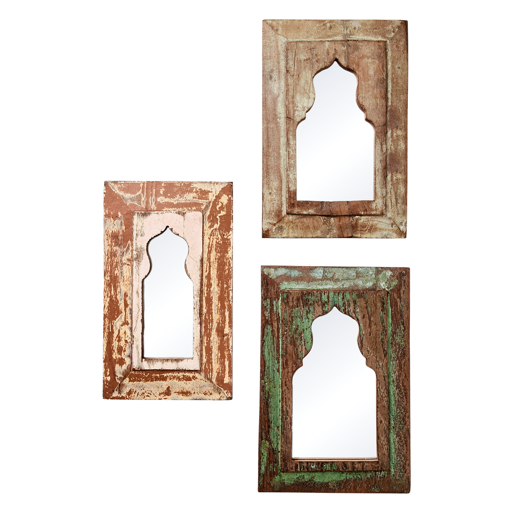 Unik spegel med rustik charm i blandade färger. Tillverkad av trä och spegelglas.