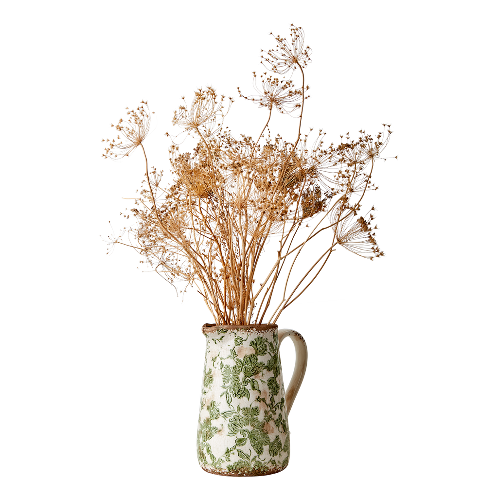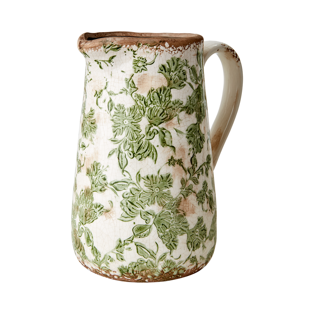 Elegant stengodskanna med grönt blommönster och rustik vit finish. Vattentät och perfekt för servering eller dekoration.