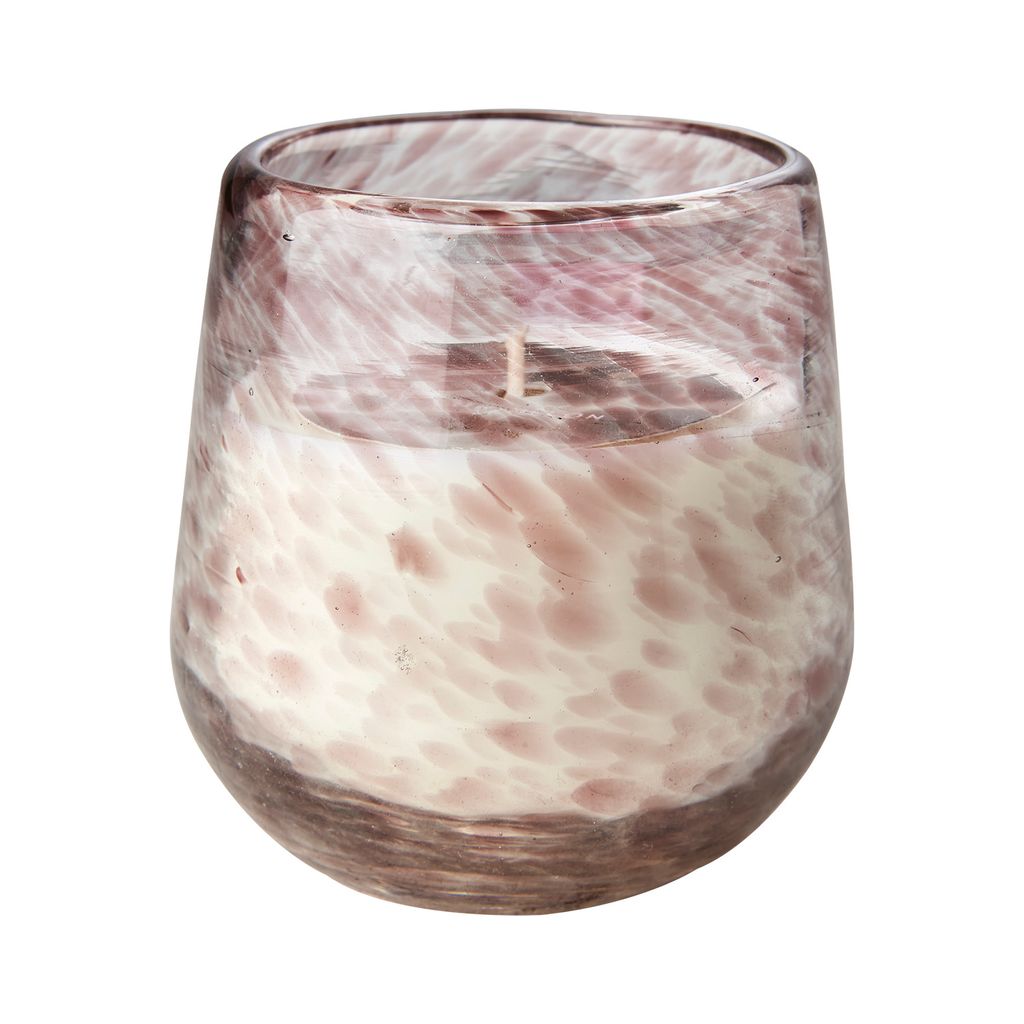 Doftljus. Genomfärgat glas. Syntetiska dofter. Munblåst. Bubblor och ojämnheter kan förekomma. Storlek och färg kan variera något.