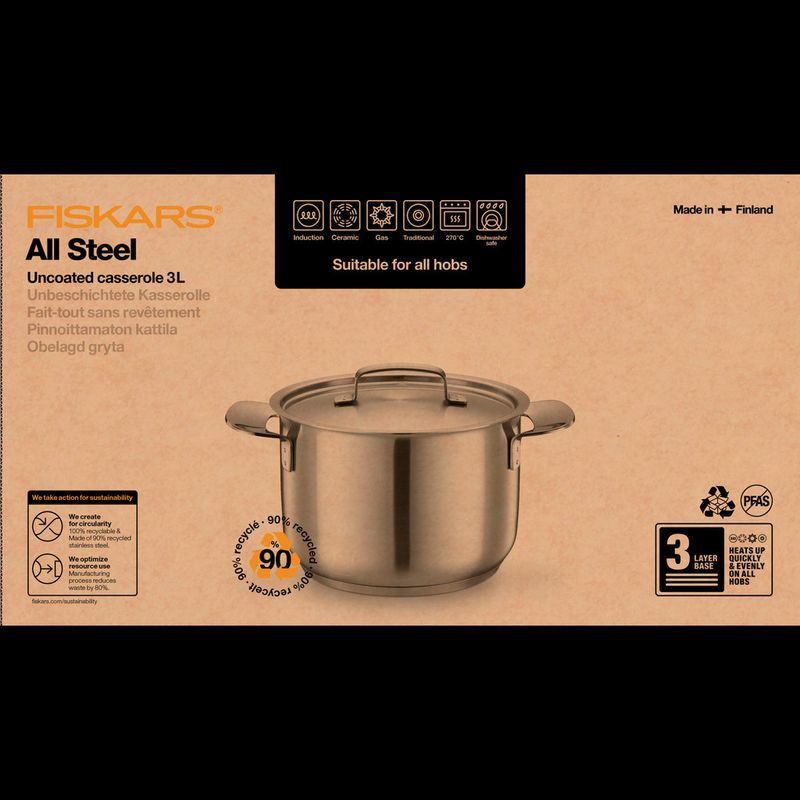 Fiskars All Steel-serien står för kompromisslös kvalitet, och denna 3-litersgryta är inget undantag. Utan beläggning, enkel att rengöra och maskindiskvänlig – en gryta som behåller sin finish och funktion år efter år. Den borstade stålytan ger ett exklusivt intryck och är motståndskraftig mot repor och slitage.