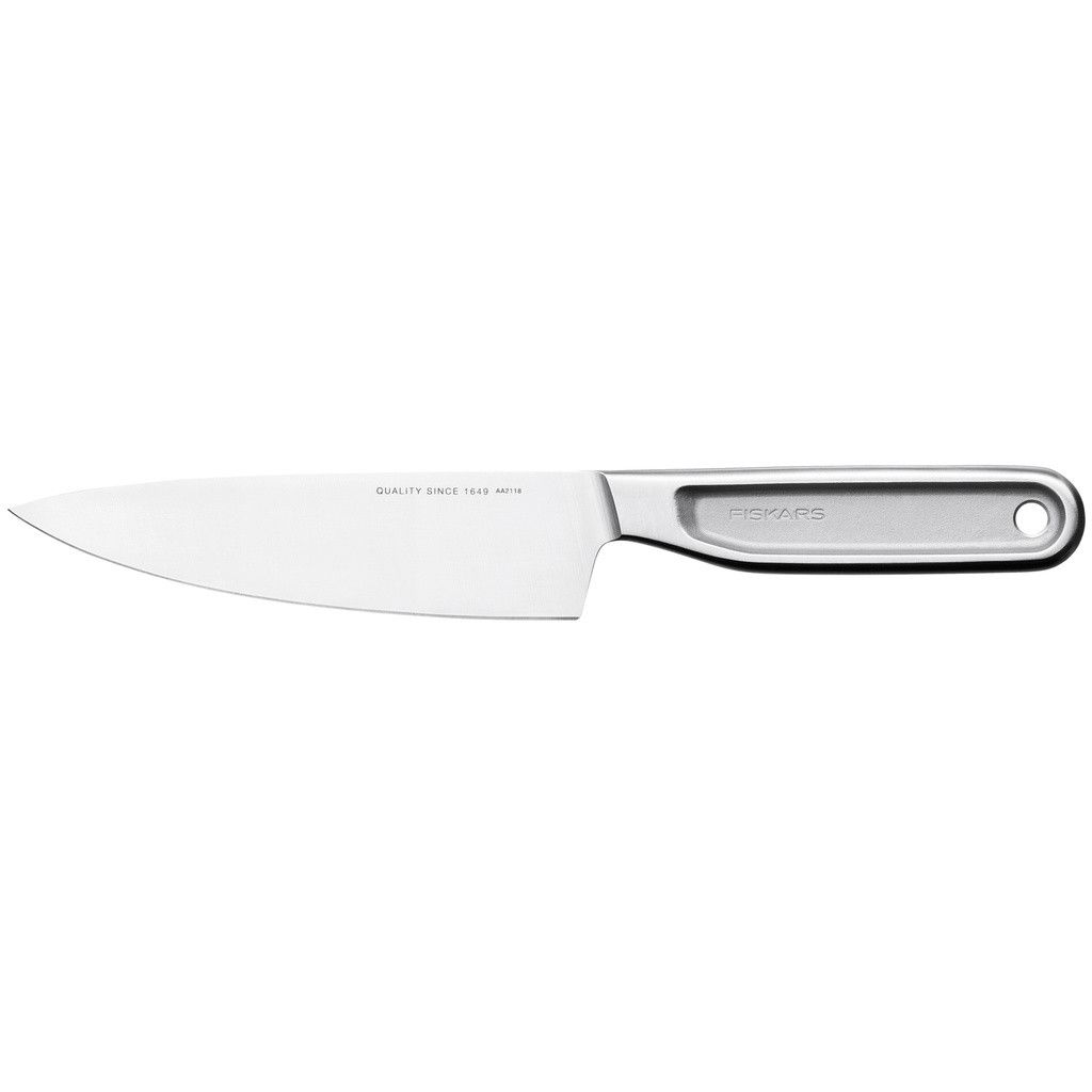 Fiskars All Steel-serien är känd för sin minimalistiska estetik och funktionella elegans. Med ett helt metalliskt utförande ger denna kockkniv ett stilrent intryck på köksbänken, samtidigt som det ergonomiska handtaget ger ett säkert grepp. Den sömlösa konstruktionen ger både balans och hygien – inga skarvar där smuts kan fastna.