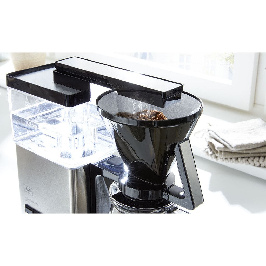 Med sin borstade rostfria yta, belysning i vattentanken och dubbla värmeelement, kombinerar Melitta Signature De Luxe stil med prestanda. Vattentanken är belyst för enkel påfyllning och den automatiska avstängningsfunktionen ger dig trygghet och energieffektivitet. Den eleganta glaskannan rymmer upp till 10 koppar och håller kaffet varmt utan att bränna det.