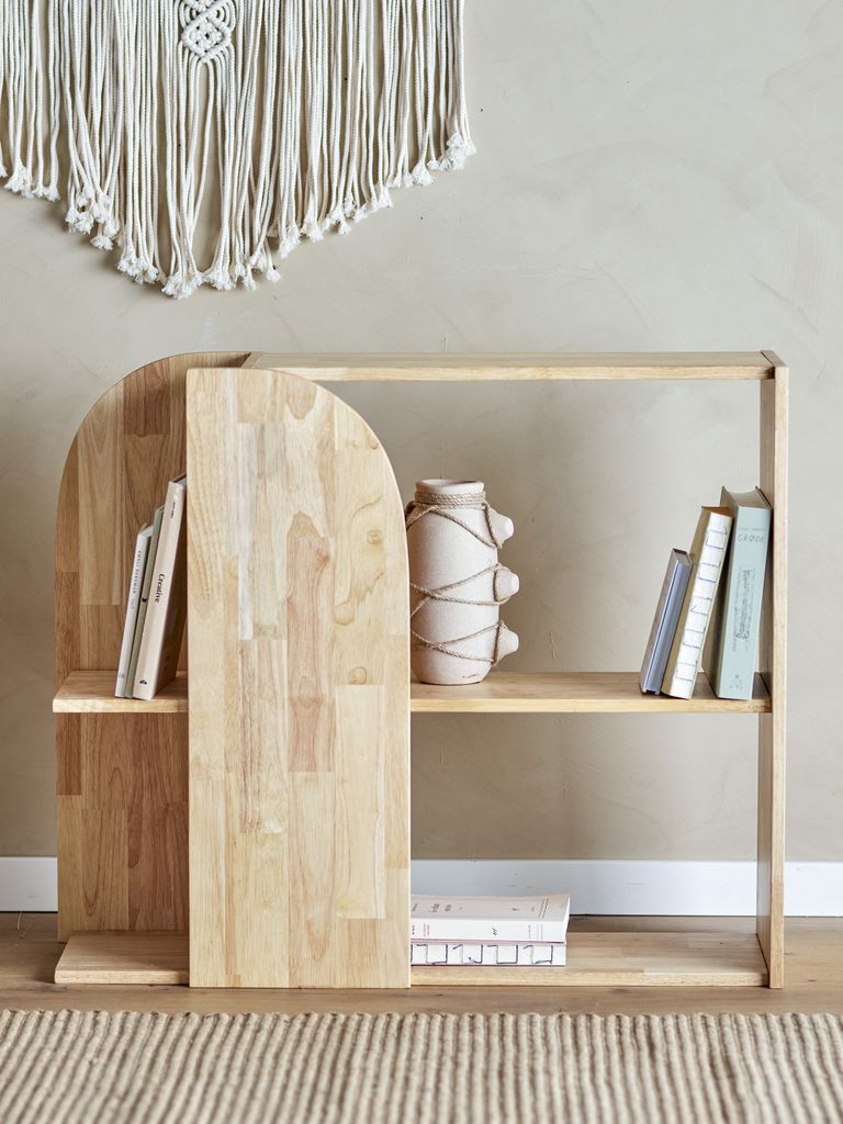 De mjukt avrundade kanterna och den naturliga färgen av gummiträ ger bokhyllan en varm och inbjudande känsla. De två hyllplanen ger gott om plats för dina favoritböcker, växter eller dekorativa föremål. Den robusta konstruktionen säkerställer hållbarhet och stabilitet.