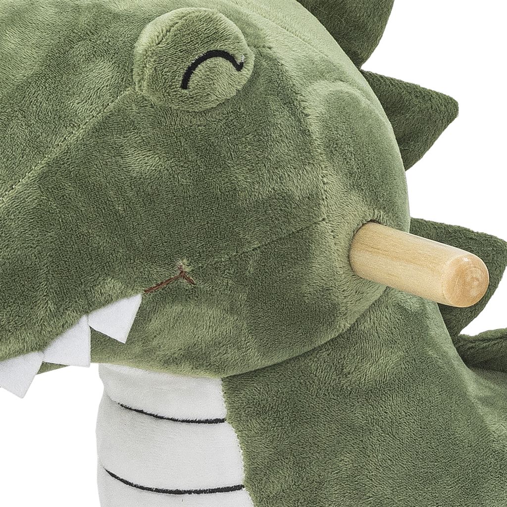 Arnie gungdjuret har en robust träbas som garanterar trygghet och stabilitet för små ryttare. Den detaljerade designen med leende ansikte och mjuka taggar på ryggen bidrar till en inbjudande och glad atmosfär.