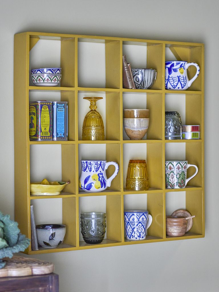 Denna mångsidiga hylla är perfekt för att visa upp dina favoritföremål eller som en mugghylla för din samling av koppar och muggar. Med sina 16 kvadratiska fack ger den gott om plats för kreativ arrangering och skapar en personlig och hemtrevlig känsla.