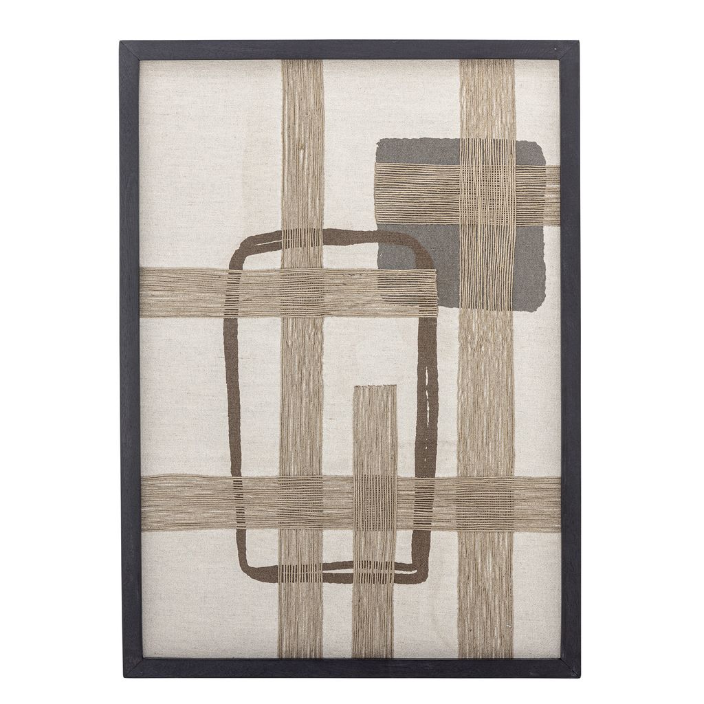 Modern väggdekoration i bomull med abstrakta former i beige och brunt, omgiven av en svart minimalistisk ram.