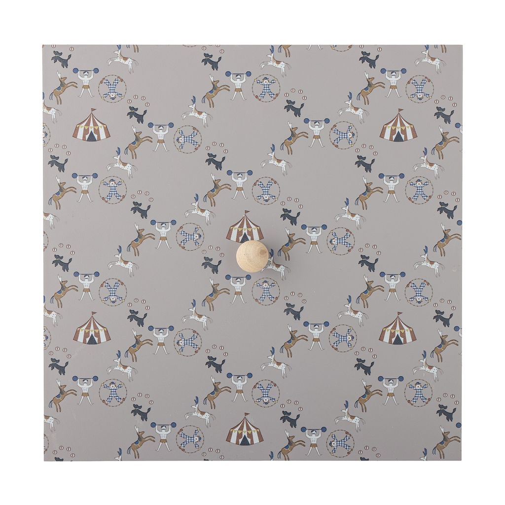 Bokhyllan har ett flertal hyllor och lådor, varav en pryds av ett sött kaninmönster, och en annan med en lekfull mönstrad design inspirerad av cirkus. Färgerna, som kombinerar dämpade toner av brunt och lila, skapar en inbjudande och lekfull atmosfär.