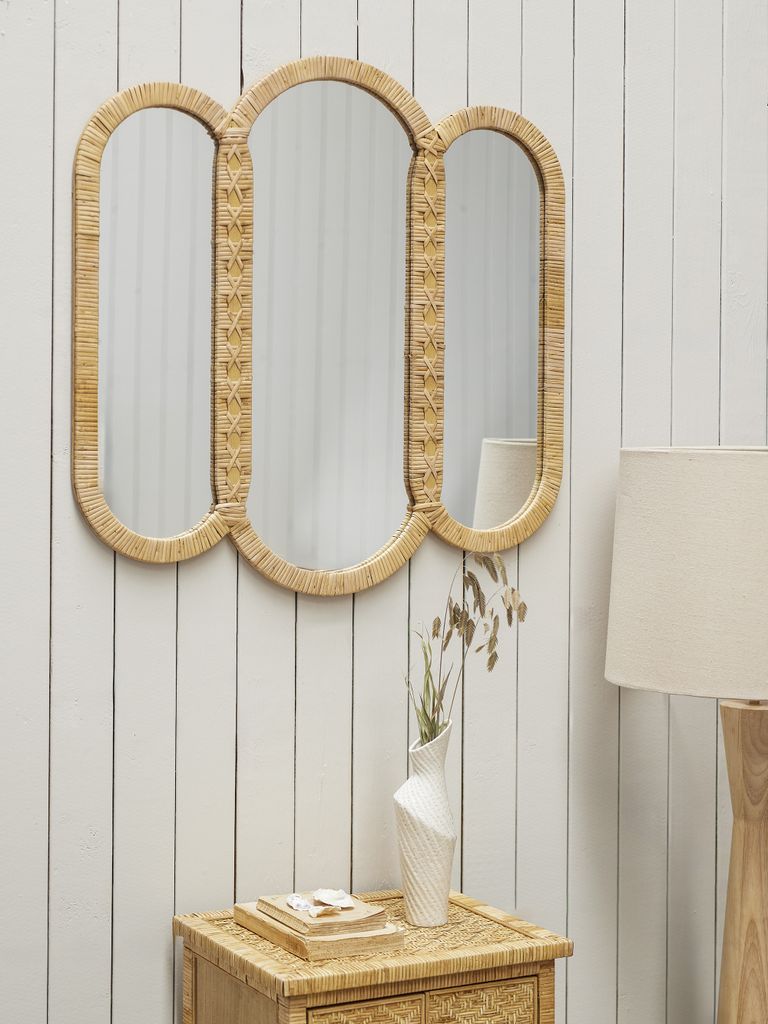 Elegant väggspegel med tre ovala speglar i en stilfull rottingram. Perfekt för vardagsrum eller sovrum.