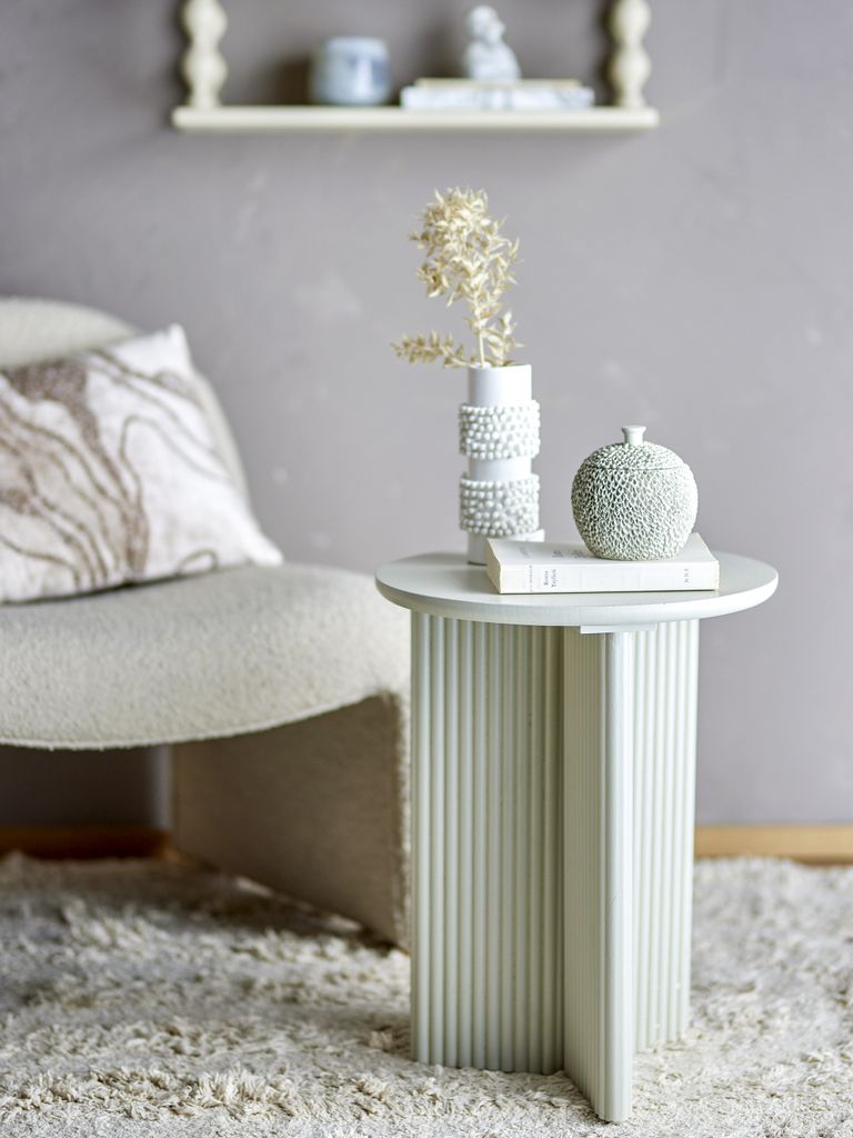 Edith Sidobord från Bloomingville erbjuder en stilren och modern design som passar perfekt i alla hem. Bordet är tillverkat i vitlackerat granträ, vilket ger det en hållbar och naturlig känsla. De räfflade detaljerna på basen tillför en unik textur och gör bordet till ett konstnärligt inslag i din inredning.