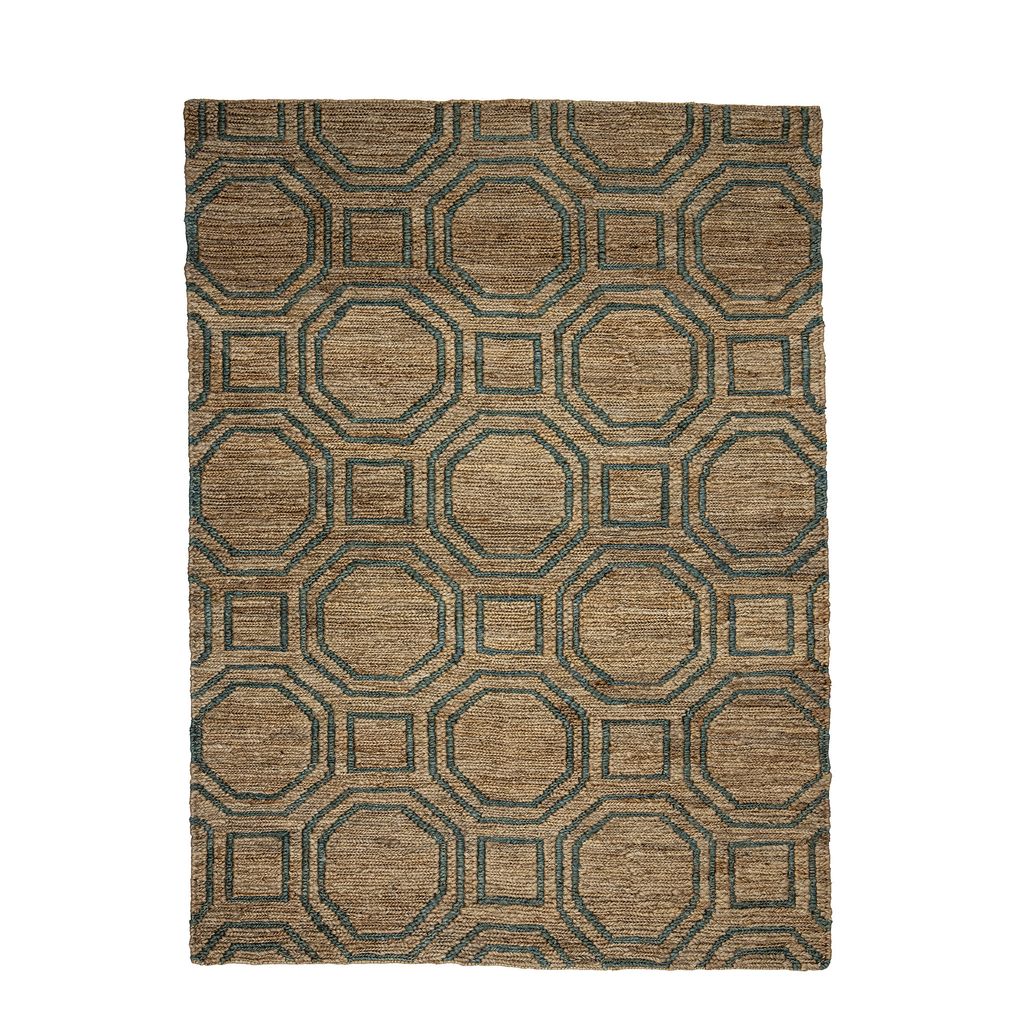 Stor och tung naturlig jute-matta med ett modernt grönt vävmönster, perfekt för hemdekoration.