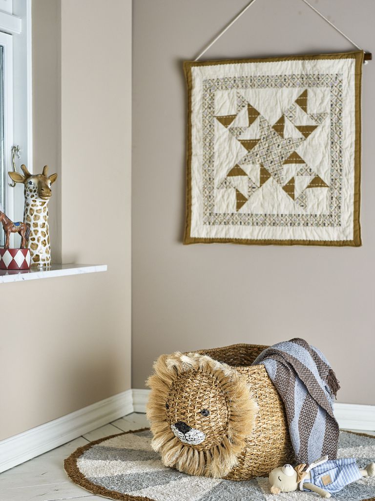 Charmig förvaringskorg i naturligt bankuangräs med lekfullt lejonmotiv. Perfekt för barnrummet.