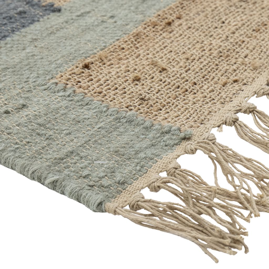 Handvävd ullmatta med grafiskt mönster i gröna och naturliga toner, dekorerad med fransar.