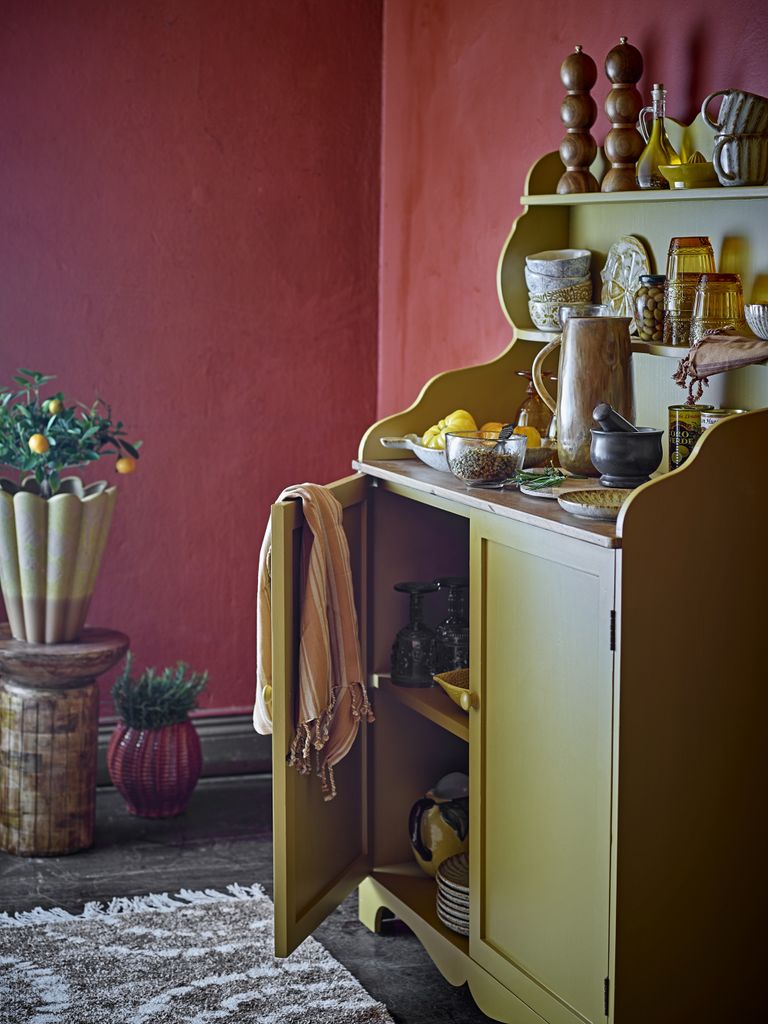 Det Bloomingville Libby Skåp är en perfekt kombination av stil och funktionalitet. Tillverkat i robust furu och MDF, och målat i en varm gul nyans med en lätt patina, utstrålar detta skåp både charm och elegans. Den rundade profilen ger en mjuk och inbjudande känsla, medan den praktiska designen med både öppna hyllor och stängda skåp gör det idealiskt för både utställning och förvaring.