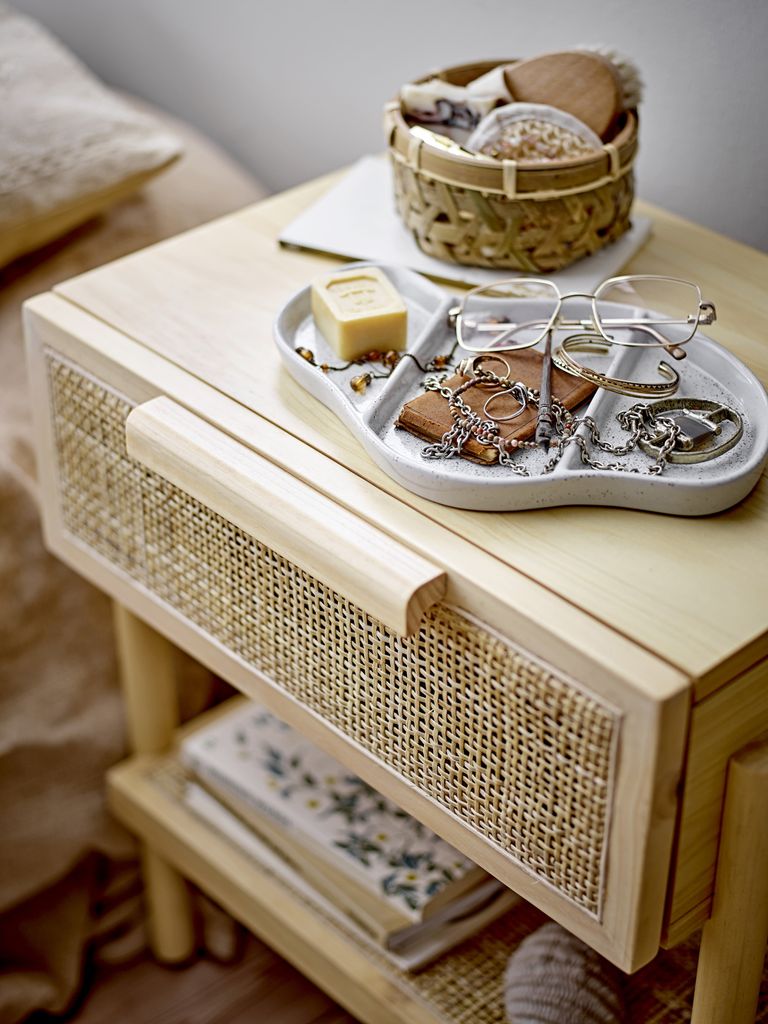 Bloomingville Manon sidobord är en stilren och funktionell möbel, perfekt för moderna hem. Tillverkat av FSC-certifierad furu och MDF-faner, kombinerar detta bord hållbarhet med estetik. Den naturliga färgen ger ett varmt och inbjudande intryck, medan de eleganta rottingdetaljerna på lådan tillför en bohemisk touch. Bordet är utrustat med en praktisk låda som erbjuder enkel förvaring av småsaker, och den nedre hyllan erbjuder extra avställningsyta för böcker eller dekor.