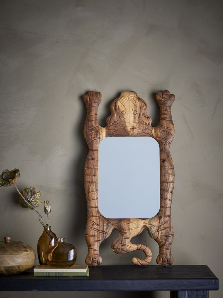 Upptäck Bloomingville Marga Väggspegel, en fantastisk dekoration som tar ditt rum till nya höjder av stil och personlighet. Denna spegel är noggrant handskarvad i akacia och formar en kreativ tigerdesign, vilket ger en lekfull och exotisk känsla till ditt hem.