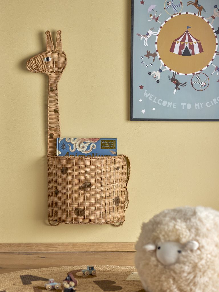 Charmig väggkorg från Bloomingville i form av en giraff, perfekt för förvaring av barnens små skatter.