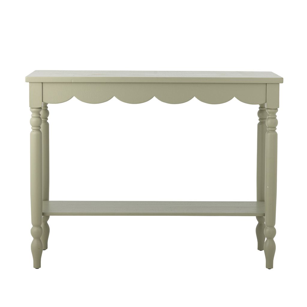 Bloomingville Salla konsolbord är en perfekt kombination av stil och funktionalitet. Tillverkat av högkvalitativt furuträ, har detta bord en elegant dammig grön färg med en subtil patina som ger en vintage känsla. Den vågiga kanten på bordsskivan ger en dekorativ dimension samtidigt som den extra hyllan erbjuder praktisk förvaring.