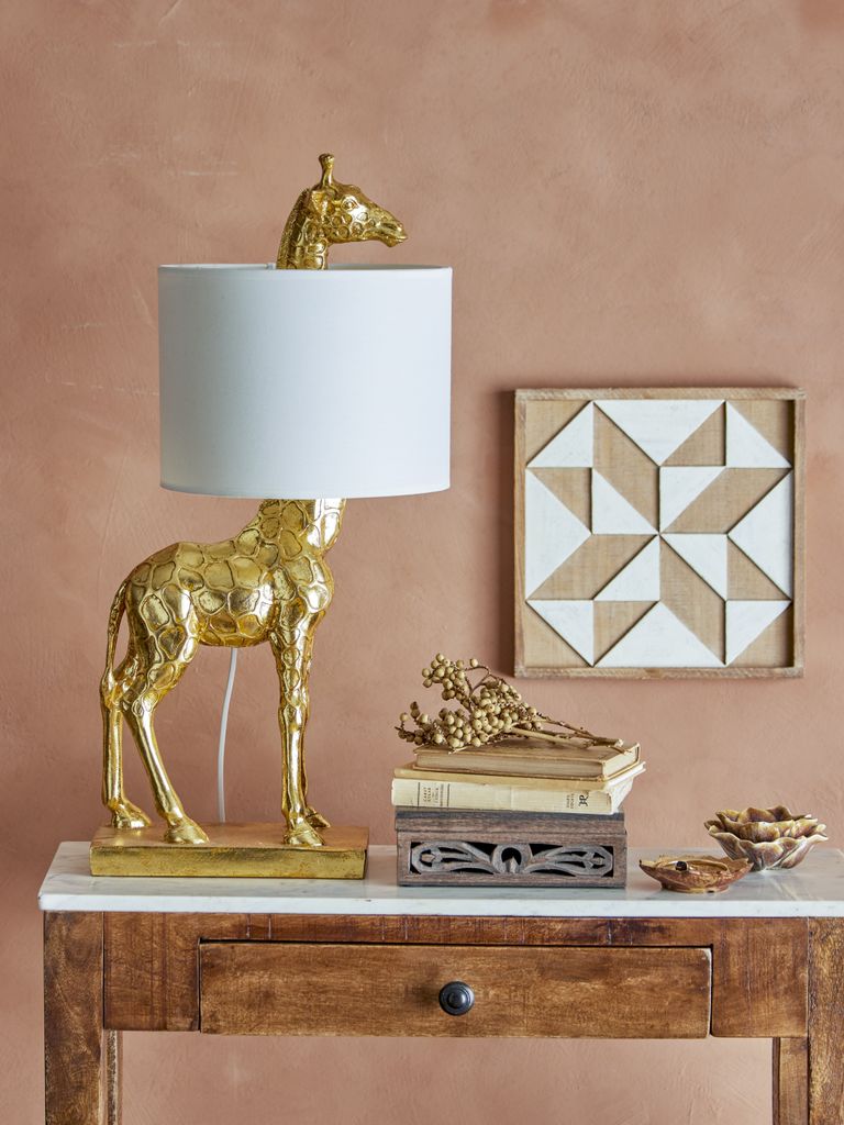 Silas girafflampa från Creative Collection är en iögonfallande inredningsdetalj som omedelbart blir rummets blickfång. Den ståtliga giraffen i guldfinish ger lampan ett lekfullt men samtidigt exklusivt uttryck. Med sin imponerande höjd på 70 cm fungerar den lika bra som bordslampa som en mindre golvlampa, vilket gör den enkel att placera efter behov och stil.