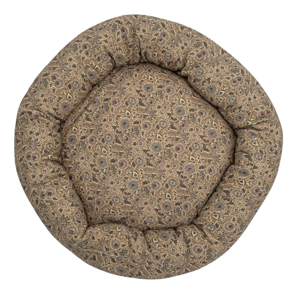 Elegant brun hundkorg av bomull med blomsterdesign, perfekt för stil och komfort i hemmet.