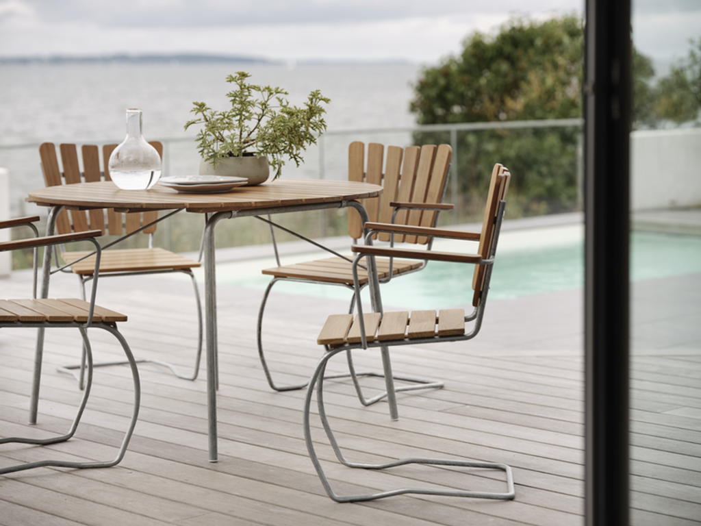 Elegant och hållbart matbord i teak och varmgalvaniserat stål. Perfekt för utomhusbruk och kan enkelt fällas ihop.