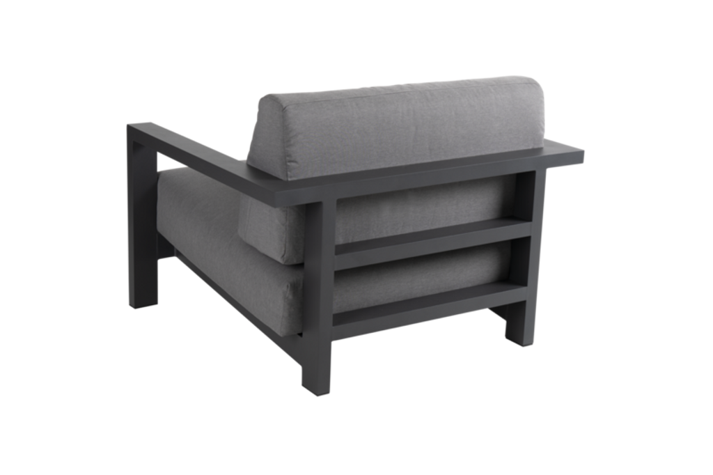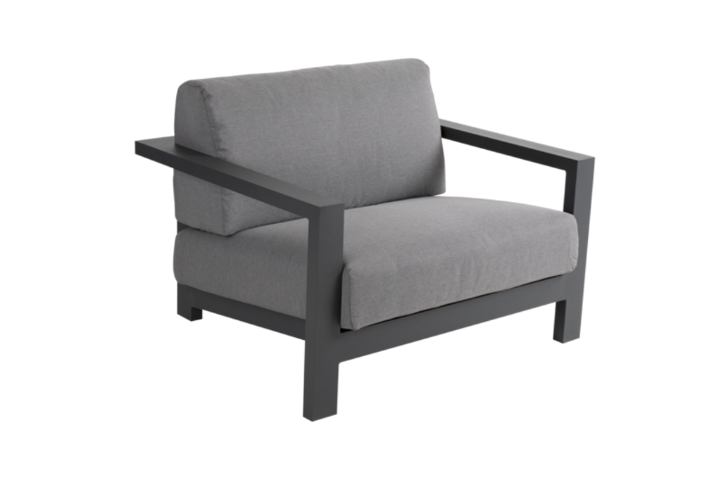 Stilren och hållbar fåtölj i pulverlackerad aluminium med olefintyg, perfekt för uteplatsen.