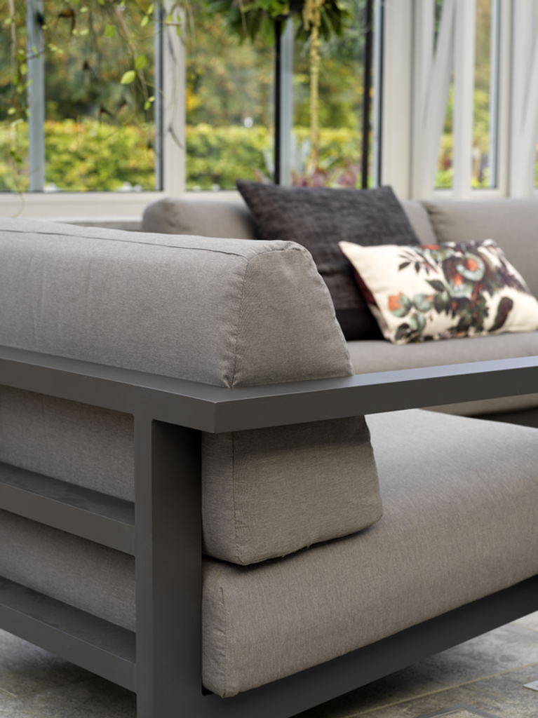 Material och hållbarhet: Fåtöljen är tillverkad av högkvalitativt, pulverlackerat aluminium som är rostfritt och lättskött. Dynorna är klädda i slitstarkt olefintyg, vilket ger en mjuk och bekväm sittupplevelse.
