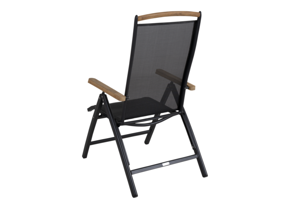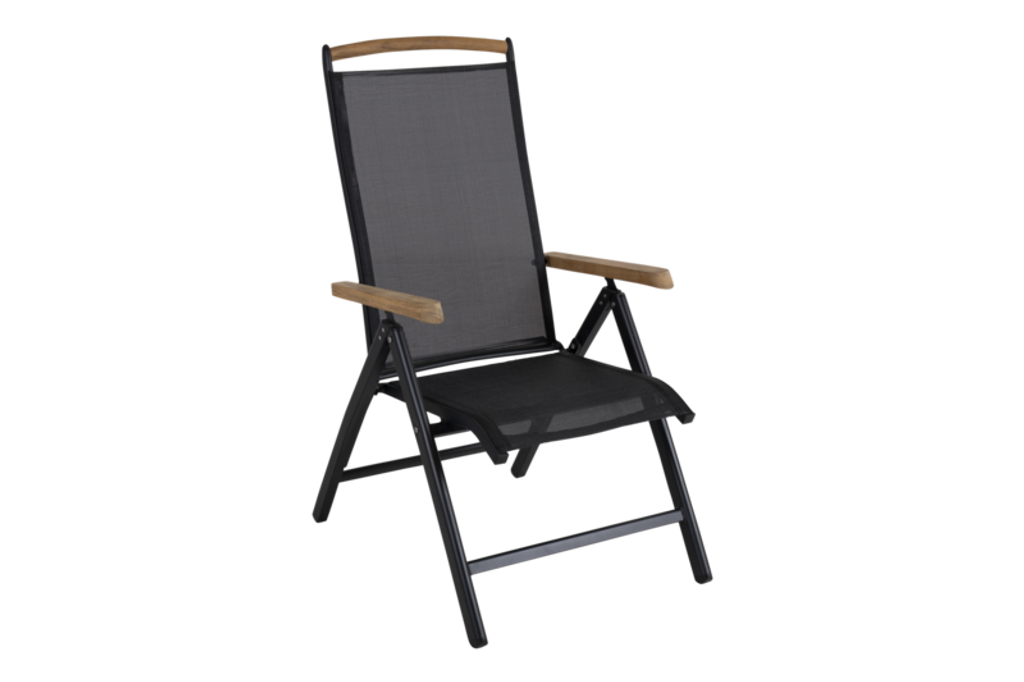 Andy positionsfåtölj från Brafab kombinerar stil och komfort med aluminiumstomme, textilene rygg och teakarmstöd.