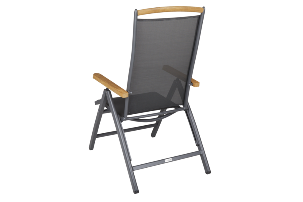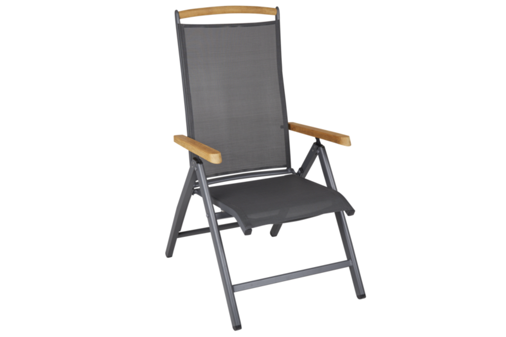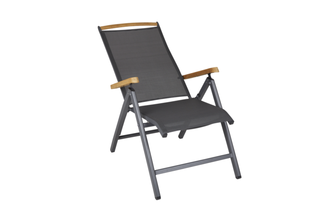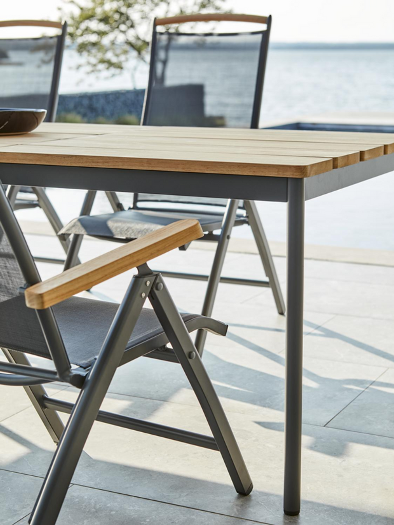 Modern positionsstol i antracit med slitstarkt textilene och eleganta teakarmstöd. Perfekt för uteplatsen.