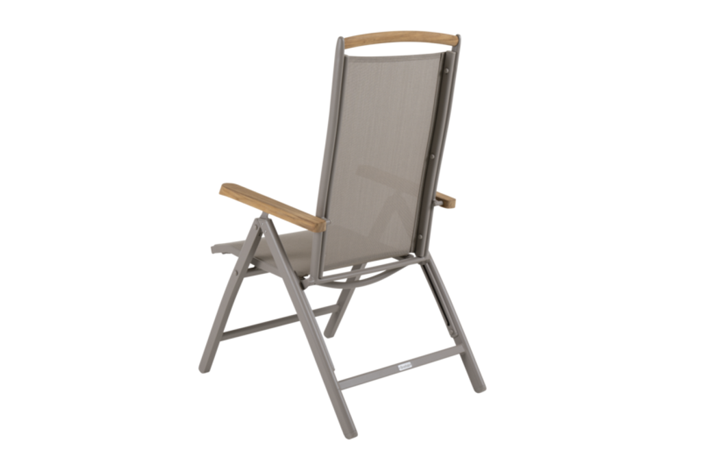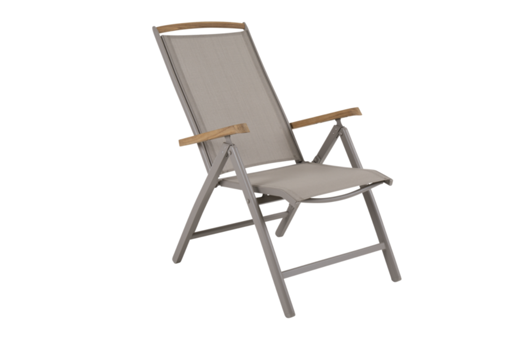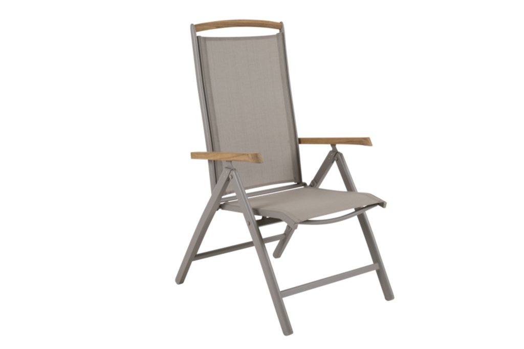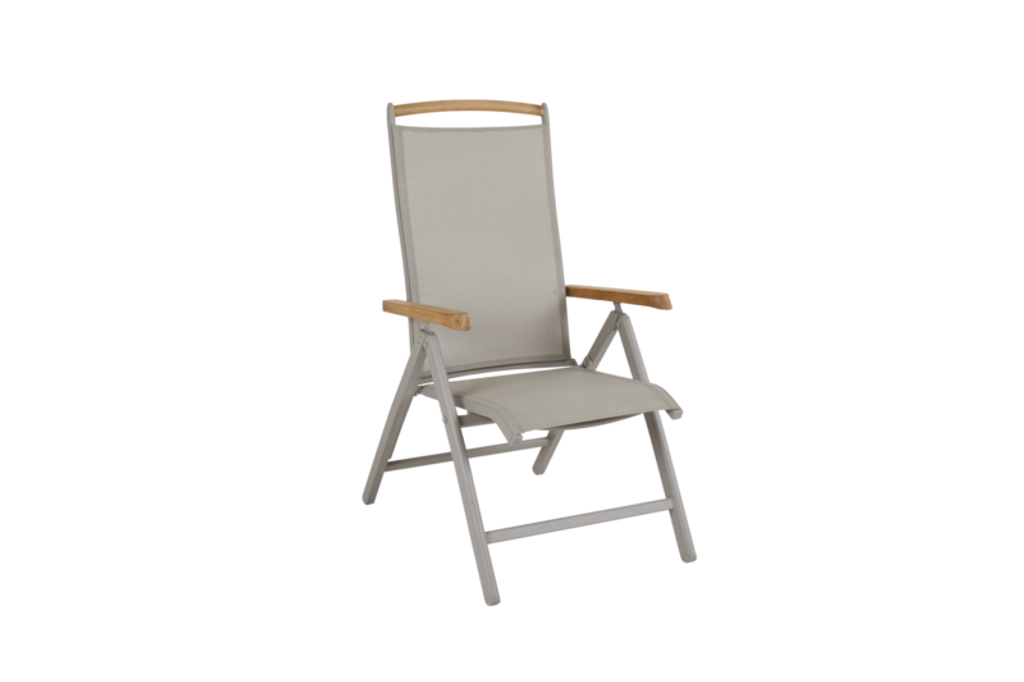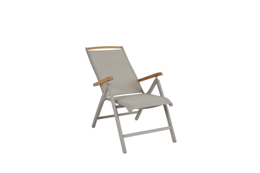 Modern positionsstol i khaki med pulverlackerad aluminium, textilene och teak för stil och komfort.