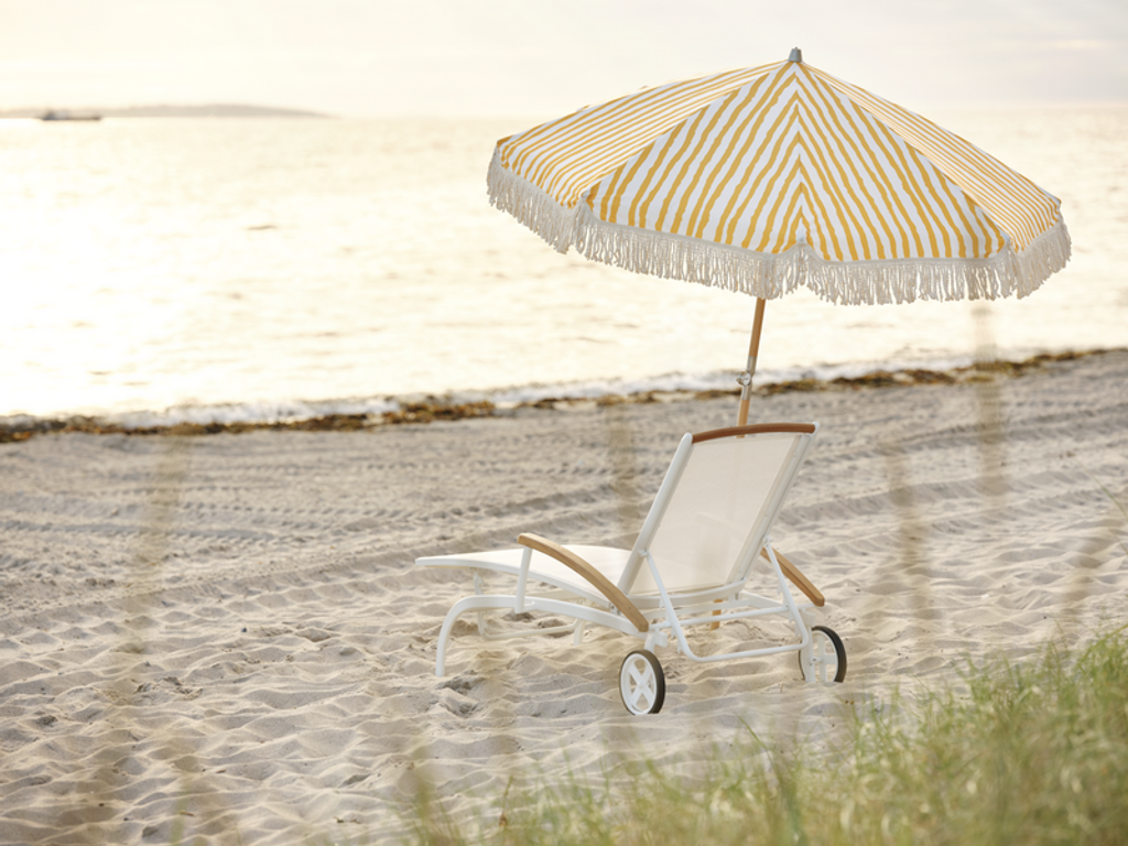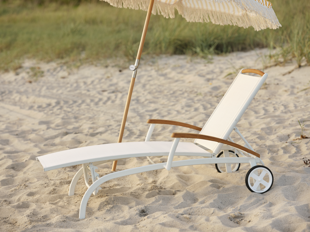Stilren vilsäng i aluminium, textilene och teak med justerbar rygg- och fotdel. Perfekt för trädgården.