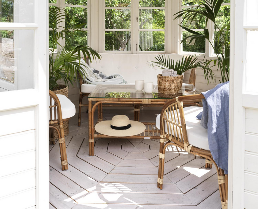 Den naturliga färgtonen i rottingen smälter vackert in i en grönskande miljö, vilket kan ses på inspirationsbilden där bordet står i harmoni med omgivande växter och naturligt ljus.