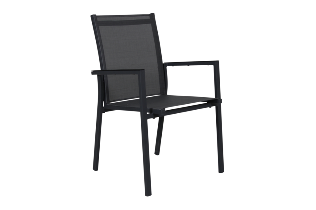 Textilene-materialet i sits och ryggstöd ger komfort och är samtidigt slitstarkt mot väder och vind. Stolen är utrustad med smakfulla armstöd i obehandlad teak, som inte bara ger en lyxig känsla utan också en vacker kontrast mot den mörka ramen.