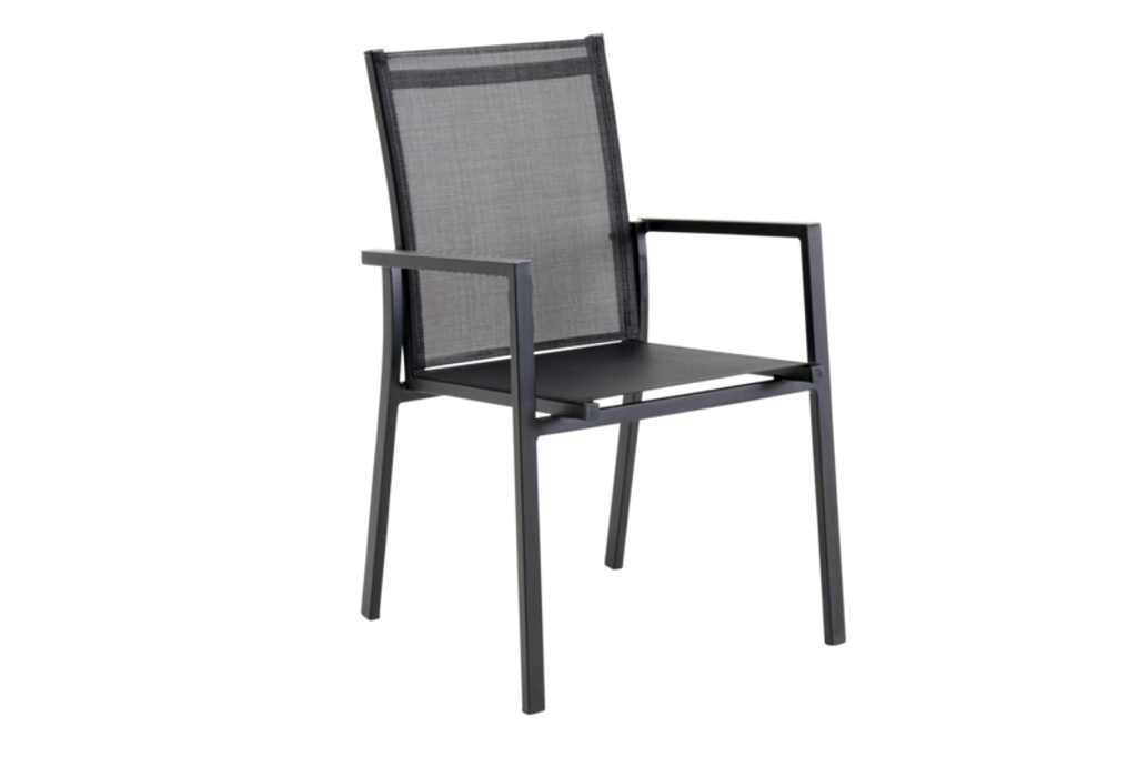 Elegant stapelstol i pulverlackerad aluminium med slitstark textileneväv och teakarmstöd, perfekt för uteplatsen.