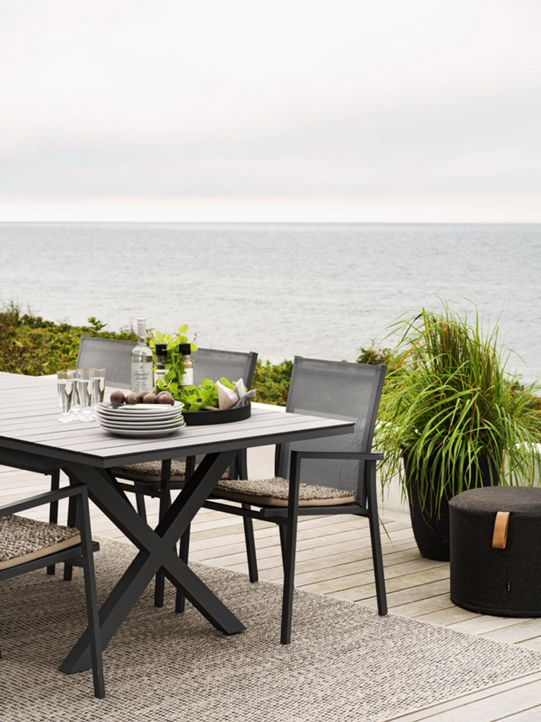 Sittdelen och ryggstödet är klädda i slitstark textileneväv, vilket inte bara erbjuder en bekväm sittupplevelse, utan också är motståndskraftig mot väder och vind. Armstöden är tillverkade i obehandlad teak, vilket tillför en naturlig och varm känsla till designen.