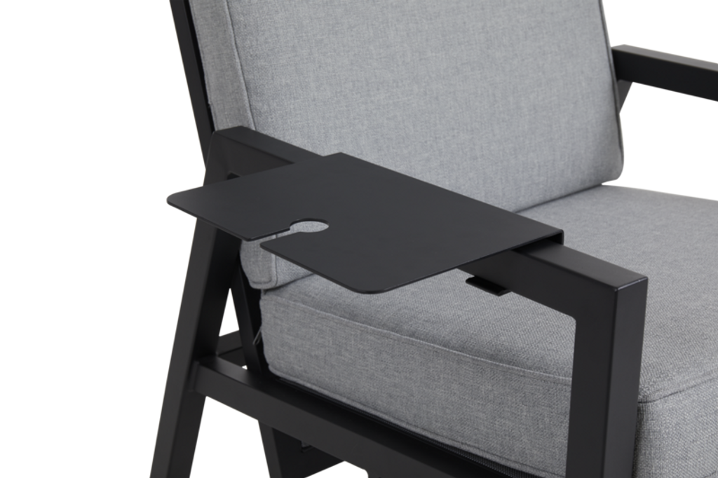 Elegant brickbord i svart aluminium som enkelt monteras på Belfort utemöbler för ökad flexibilitet och stil.