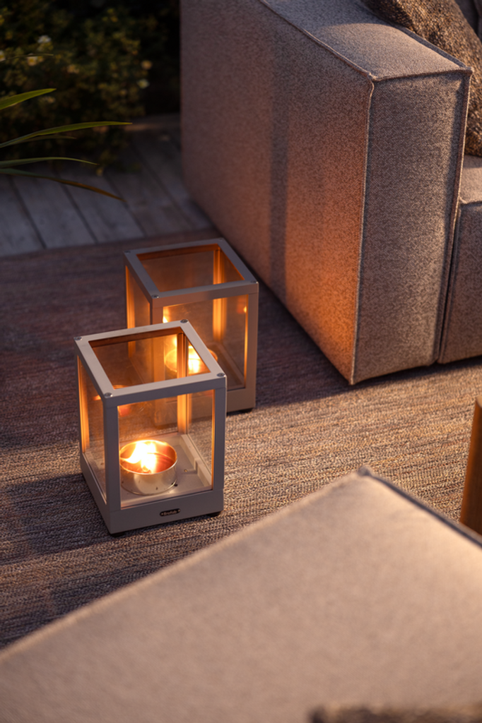 Skapa en inbjudande atmosfär i din utemiljö med denna stilrena lykta i pulverlackerad aluminium och glas.