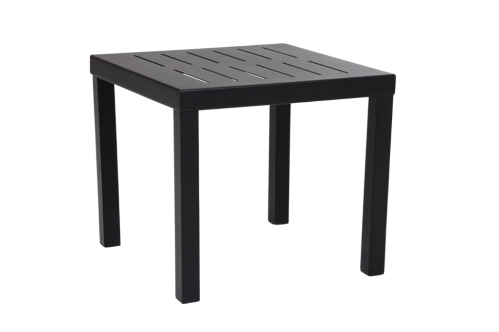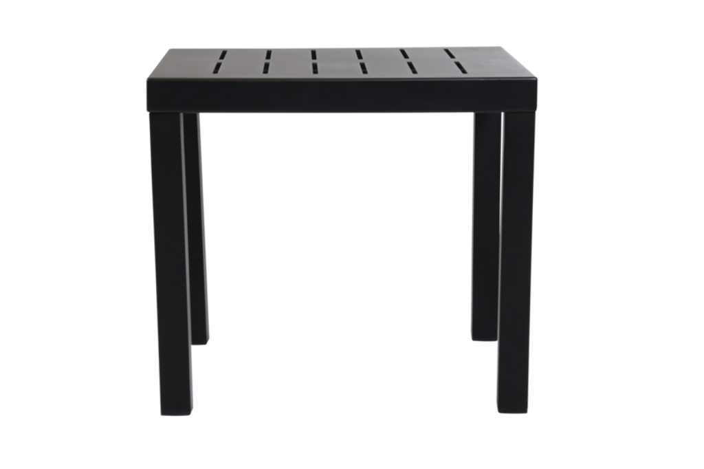 Elegant sidobord i pulverlackerad aluminium, perfekt för modern utomhusmiljö.