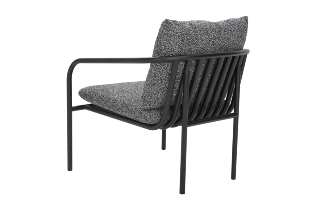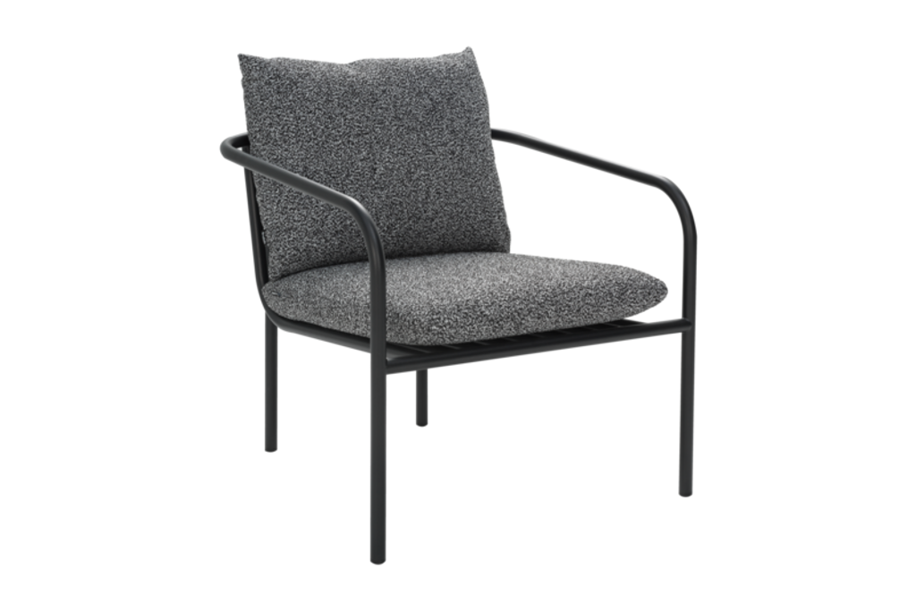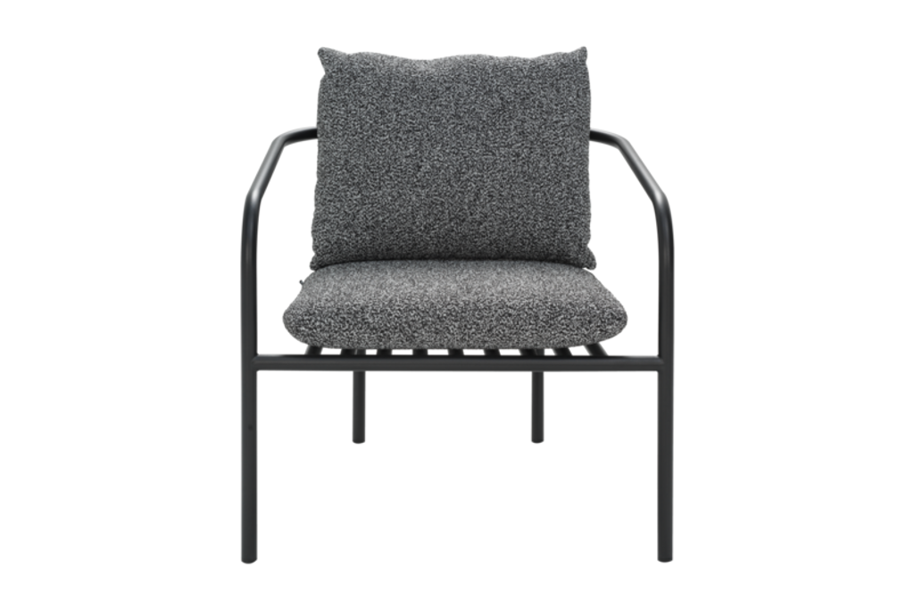 Vår Bendt fåtölj är utformad med en stilren svart ram av slitstarkt aluminium, vilket säkerställer långvarig användning i alla väderförhållanden. Den grå Teddy Ant-klädseln i polyester erbjuder en mjuk och inbjudande känsla samtidigt som den behåller en luftig och öppen design för optimal luftcirkulation.