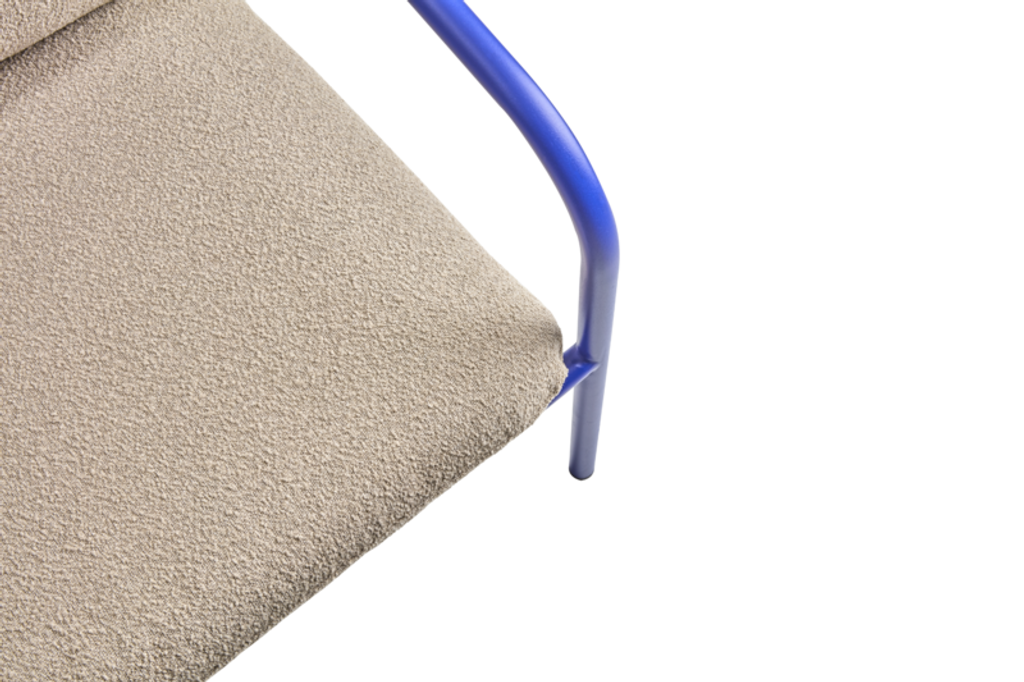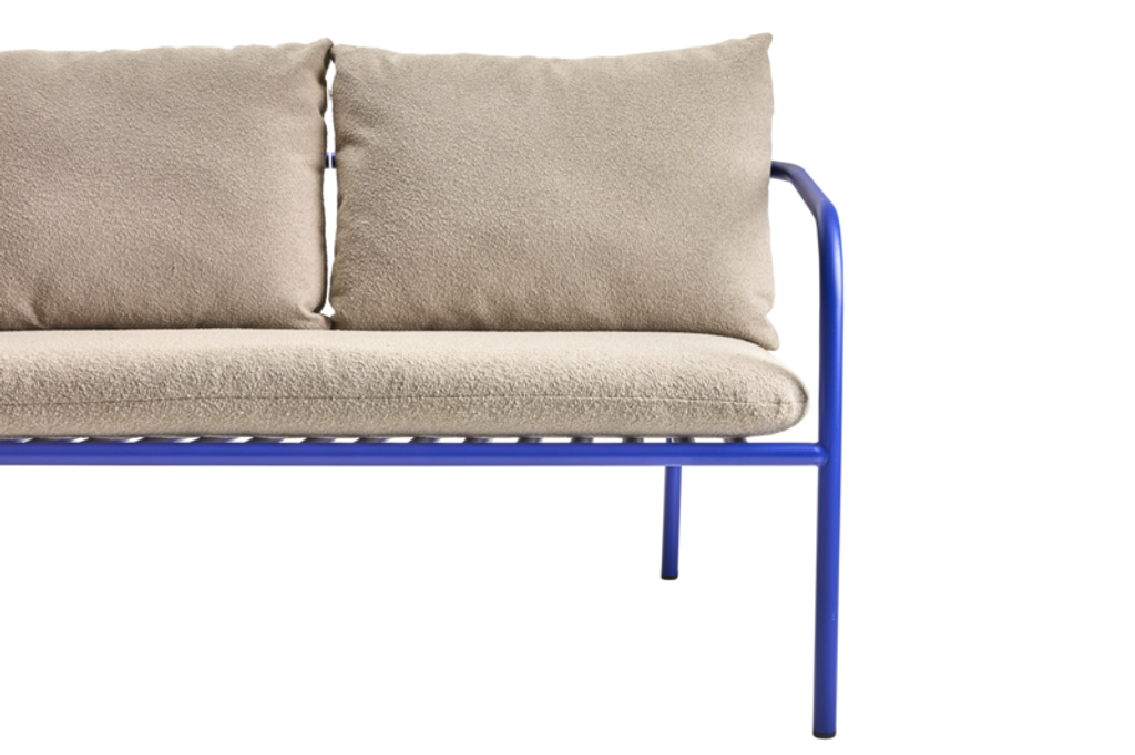 - De mjuka kuddarna i teddy beige står i vacker kontrast till den indigo blue ramen, vilket skapar en visuellt tilltalande möbel som passar perfekt för både avkoppling och sociala stunder.