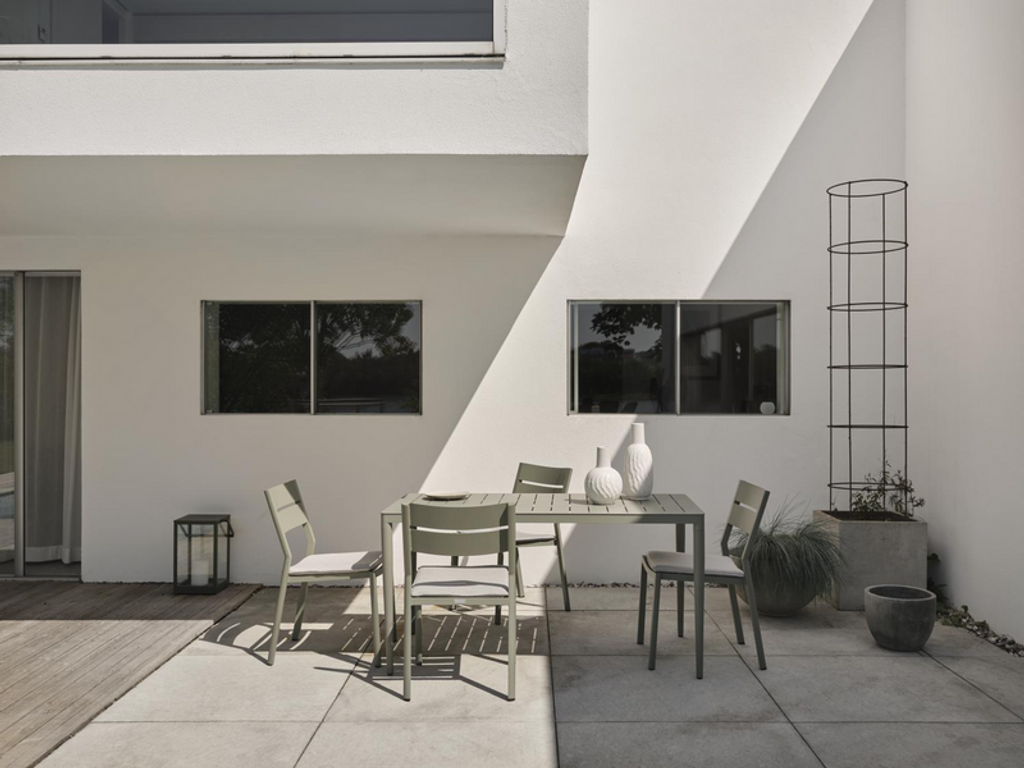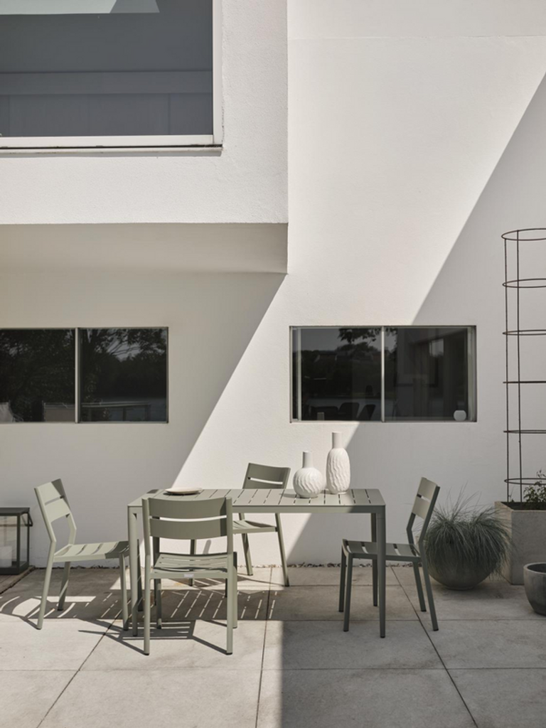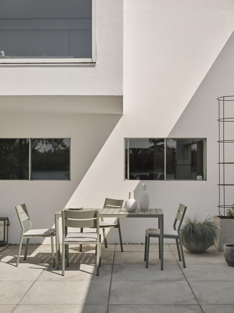 Stilrent matbord i tålig aluminium med urban känsla, perfekt för utomhusbruk året runt.