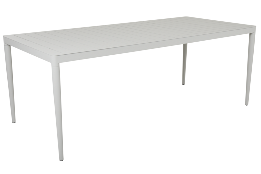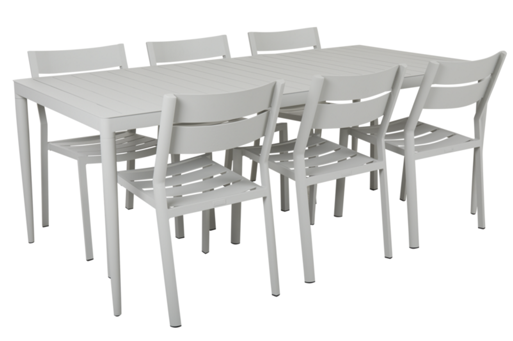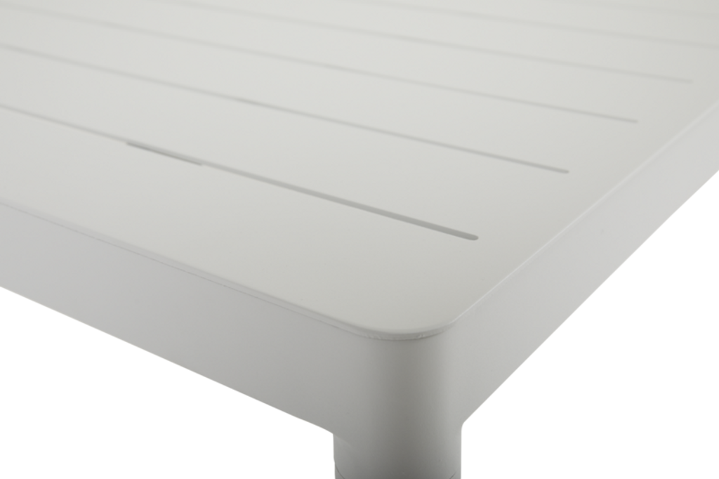 Modernt matbord i ljusgrå aluminium, designat för hållbarhet och stil i utomhusmiljöer.
