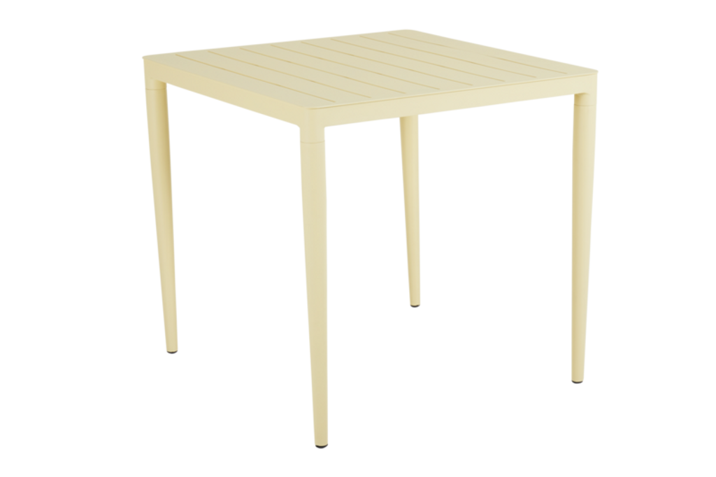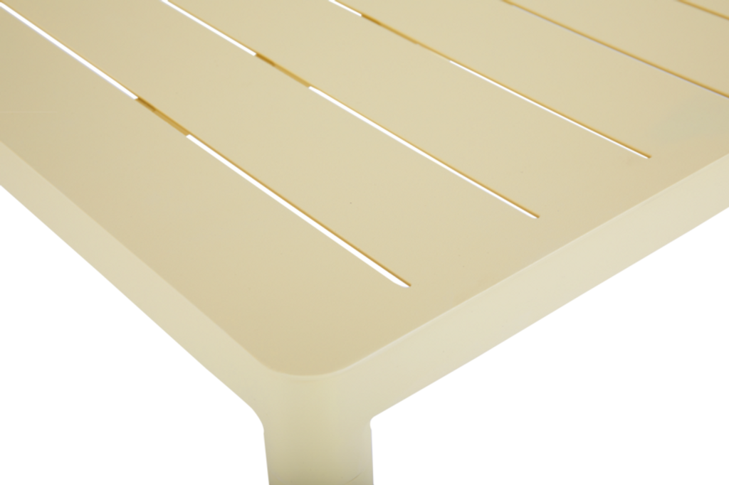 Stilrent och hållbart matbord i gul aluminium, perfekt för utomhusbruk året runt.