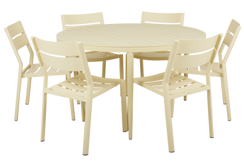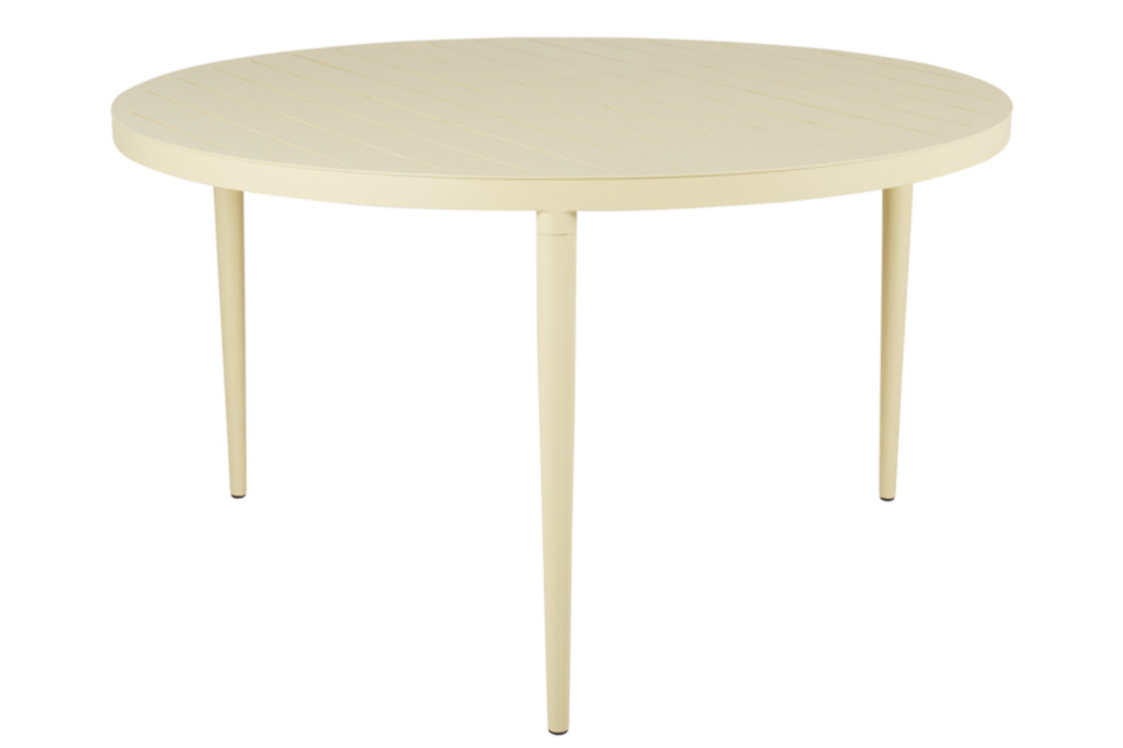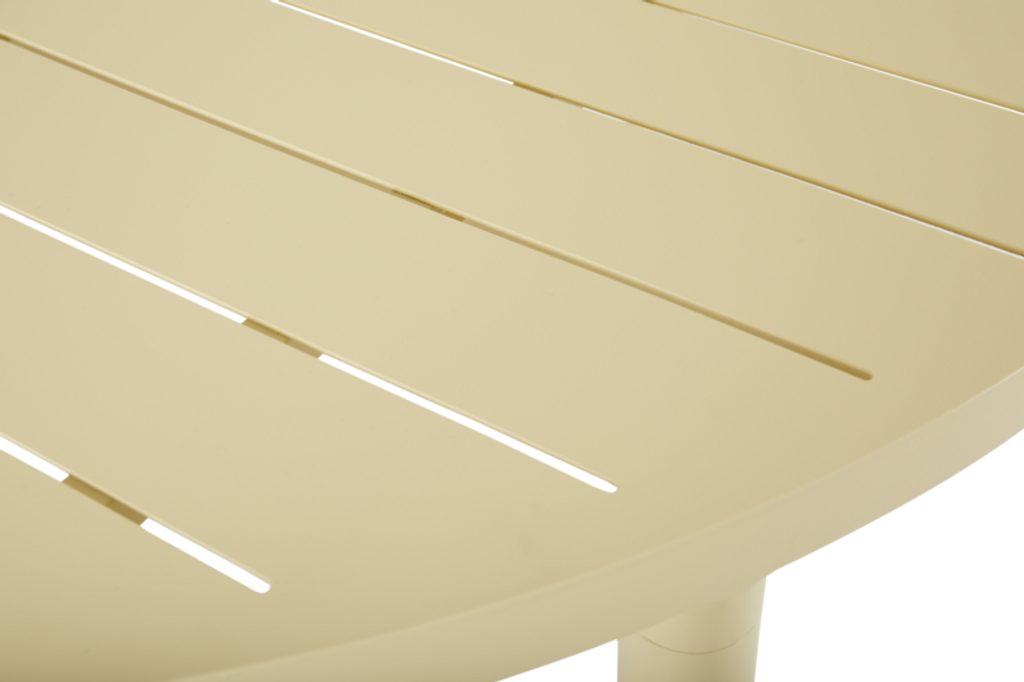 Bigby från Brafab är ett stilrent matbord i gul aluminium, perfekt för utomhusbruk året runt.
