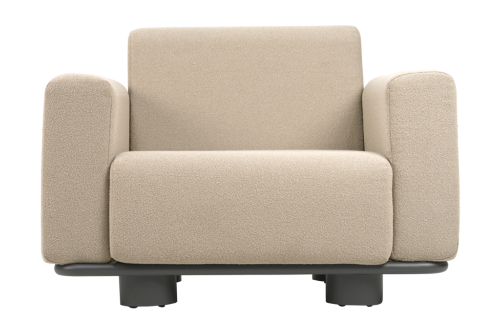 Fåtöljens design är både modern och inbjudande, med helklädda former och kraftiga ben som ger den en unik karaktär. Det vattenavvisande TPU-tyget säkerställer att dynorna är vädertåliga, samtidigt som de enkelt kan tas av och förvaras vid behov.