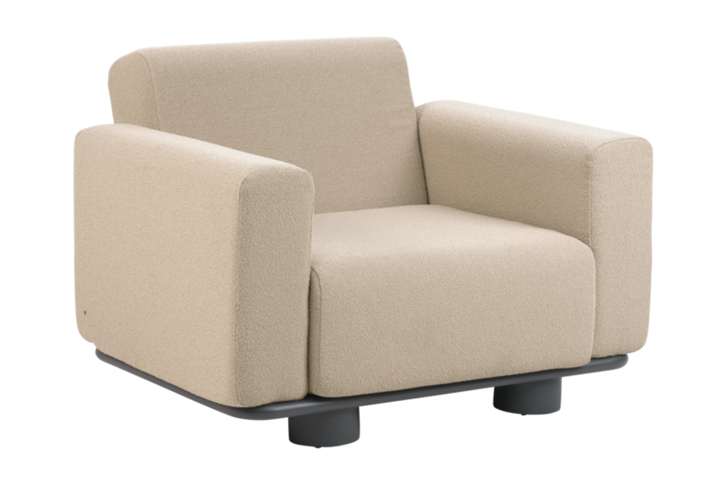 Inbjudande fåtölj för utomhusbruk med robust aluminiumram och vädertåliga Teddy-dynor.