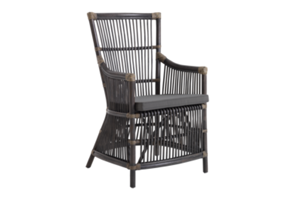 Karmstolen är utrustad med en dyna klädd i slitstarkt olefintyg och fyllt med högdensitetskum, vilket säkerställer att dynan bibehåller sin form och komfort över tid. Rottingens naturliga skönhet framhävs av de intrikata flätningarna, och de mörkare accenterna vid stolens hörn ger en extra touch av stil.