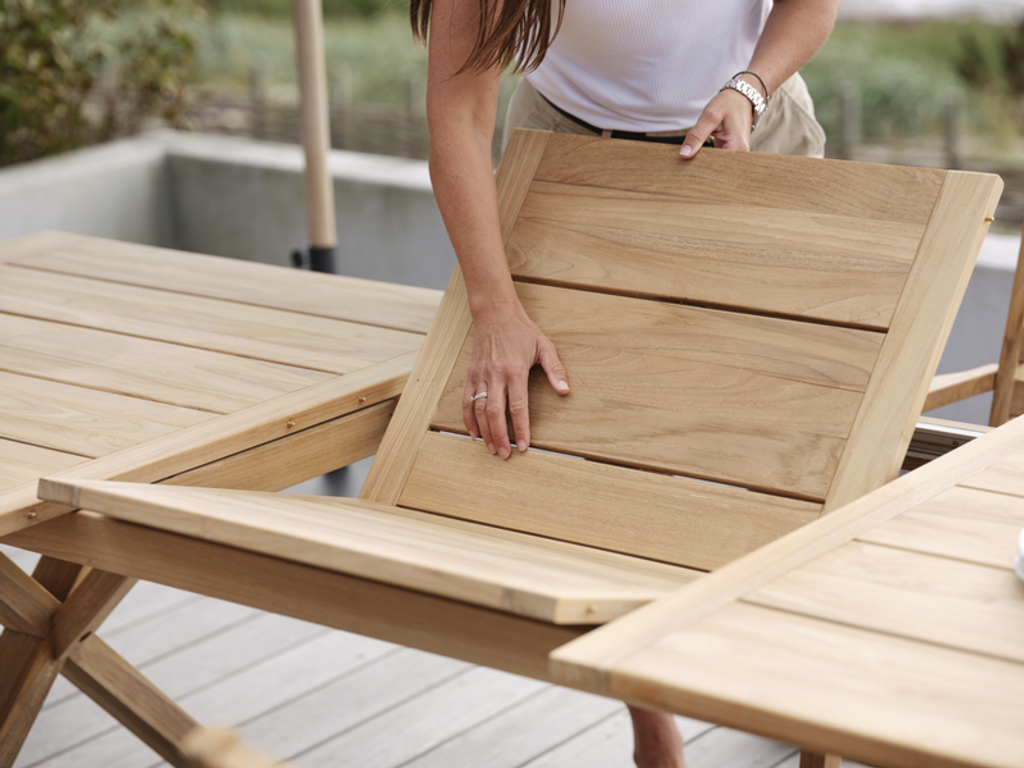 Stilrent matbord i tålig teak från Brafab. Perfekt för uteplatsen med tidlös design och naturlig patina.